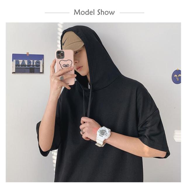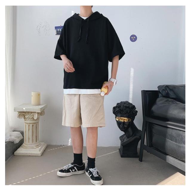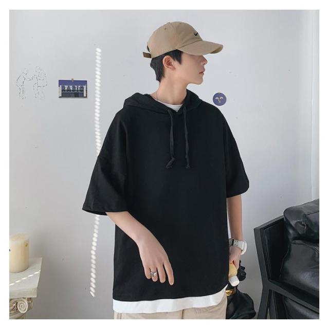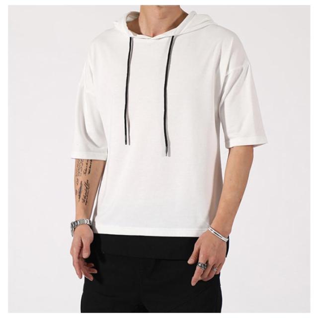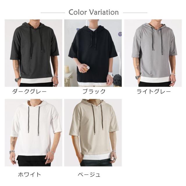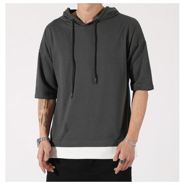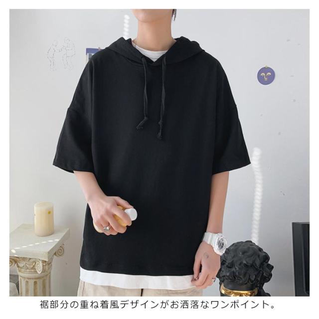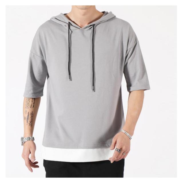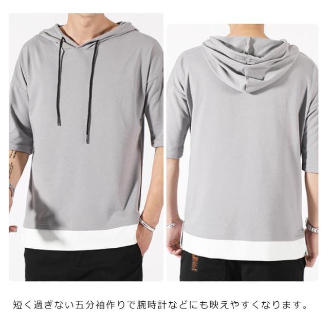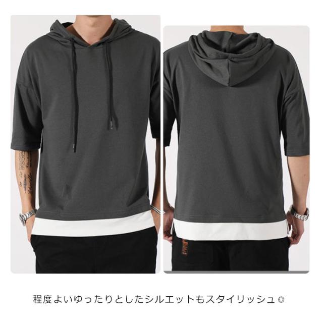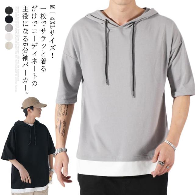 重ね着風 パーカー 五分袖パーカ M−4XLサイズ!綿100% M−4XLサイズ!綿100% Tシャツ フード付き パーカ 薄手 プルオーバーパーカー 半袖Tシャツ 五分袖 トップス 半袖 レイヤード風 カットソー メンズ 夏男 夏服 夏物 半袖