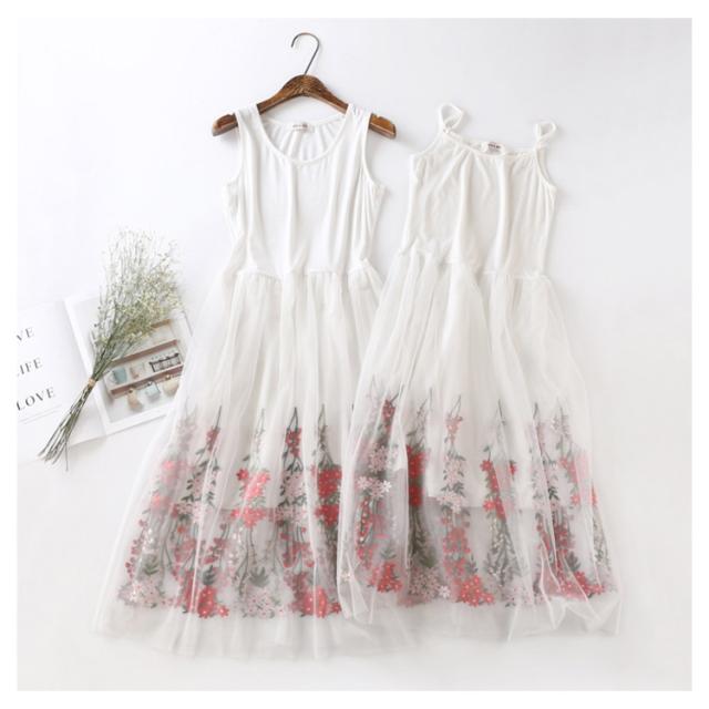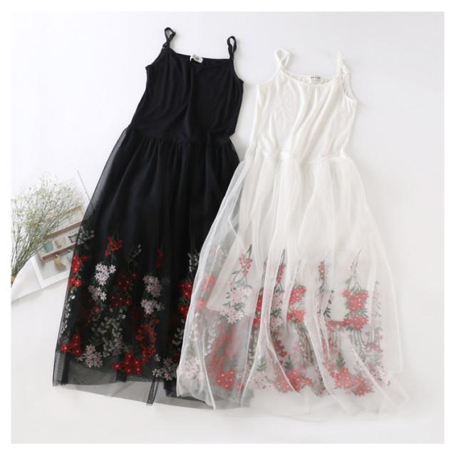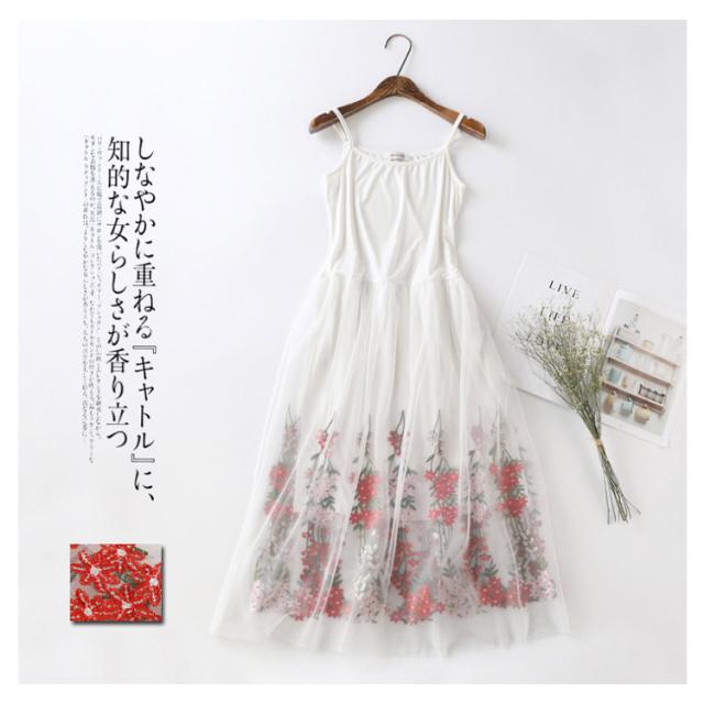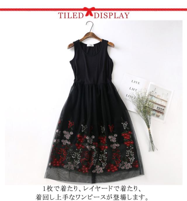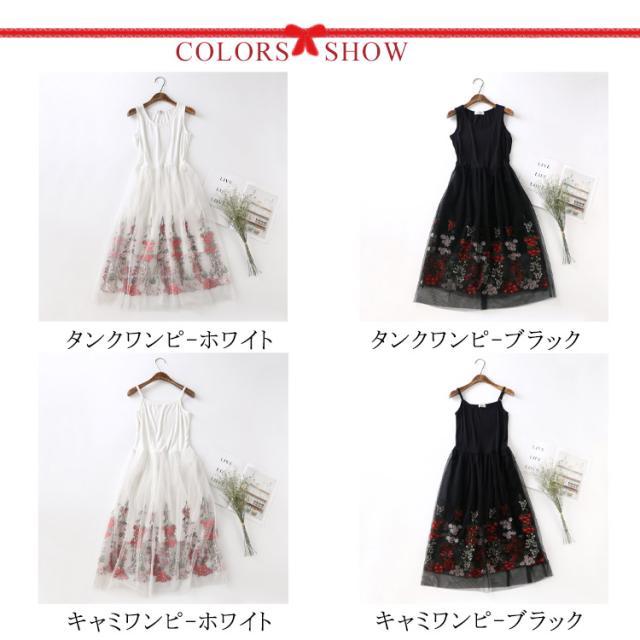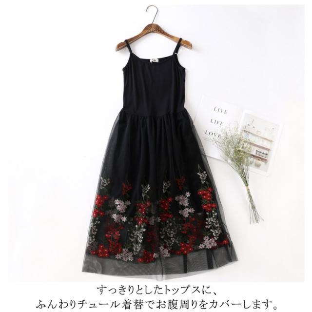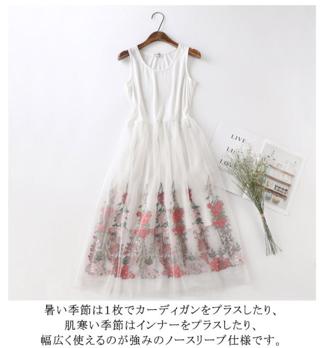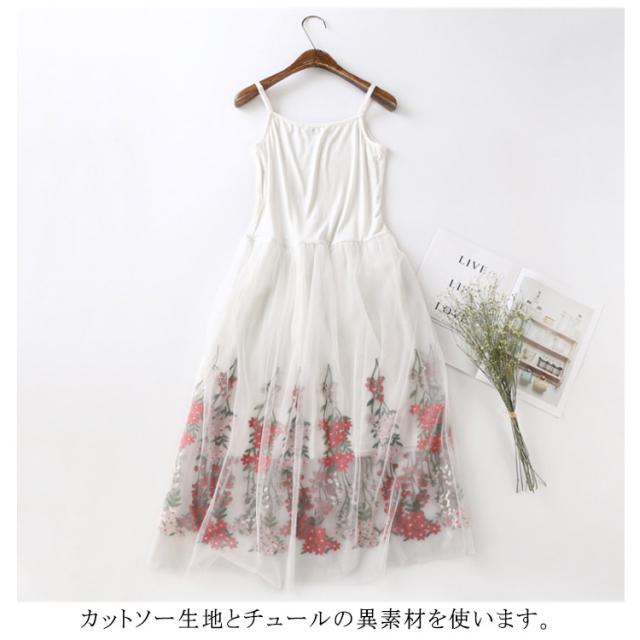 刺繍 チュール 無地 ロングワンピース チュール 袖なし タンクワンピ キャミワンピ ワンピース チュールワンピース 調整紐 伸縮 大人 かわいい チュール シンプル 春 スカート