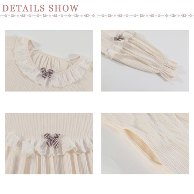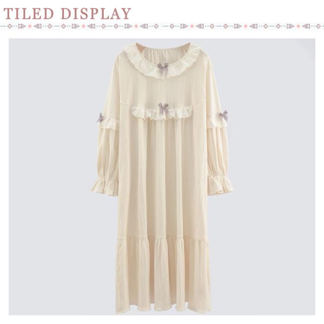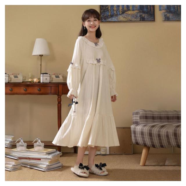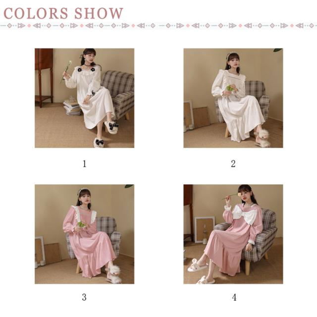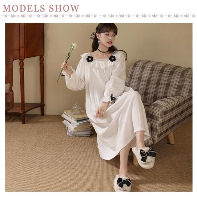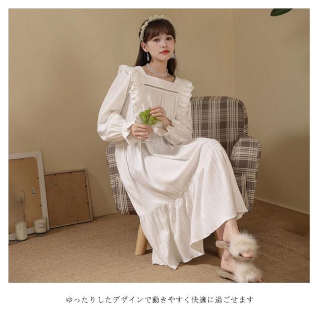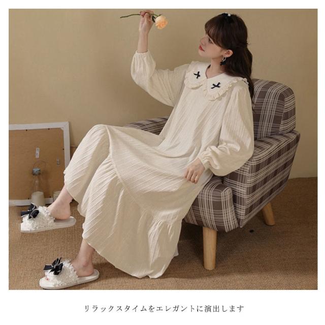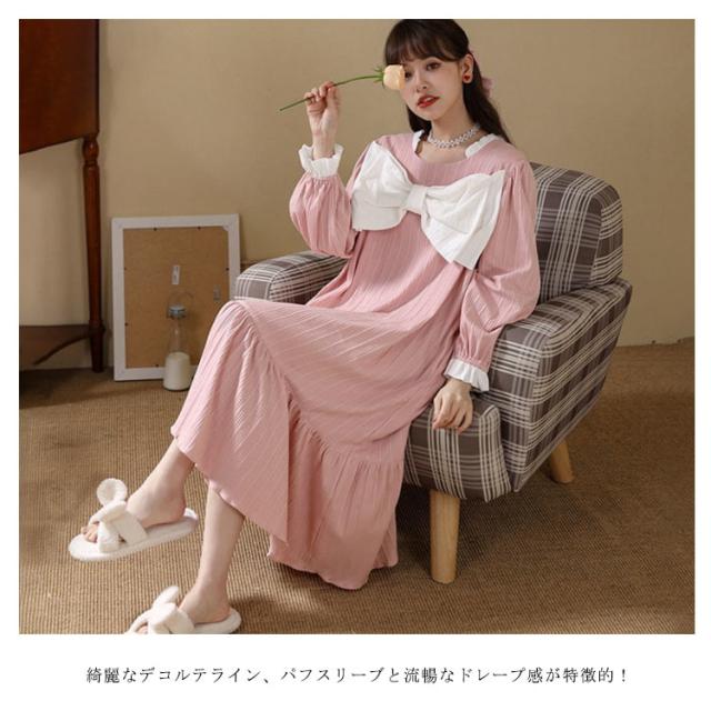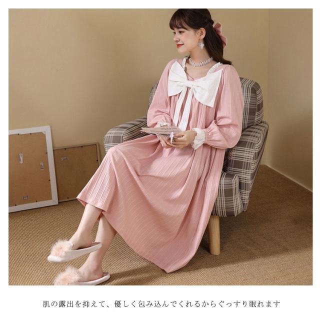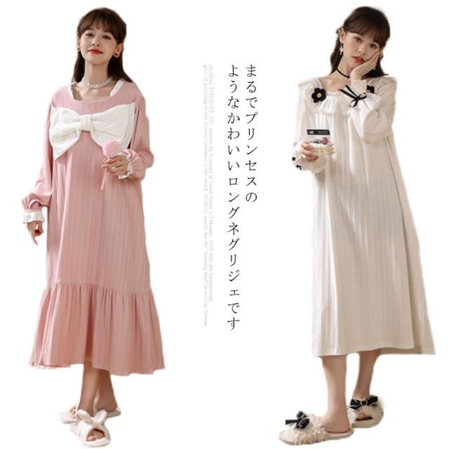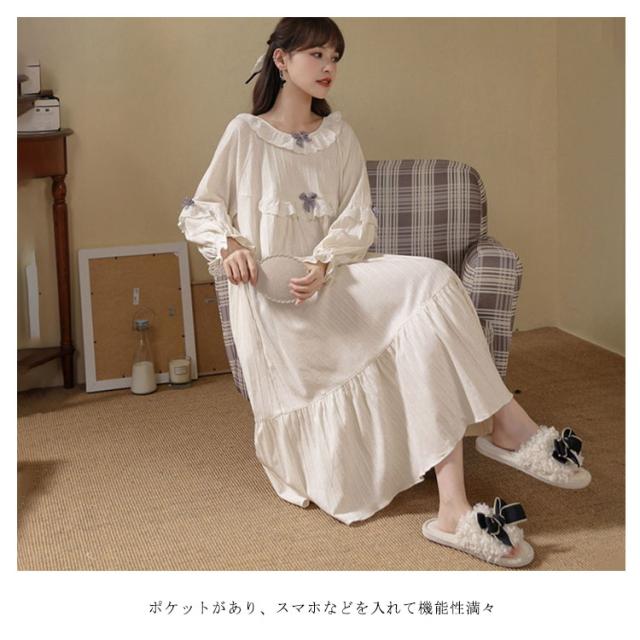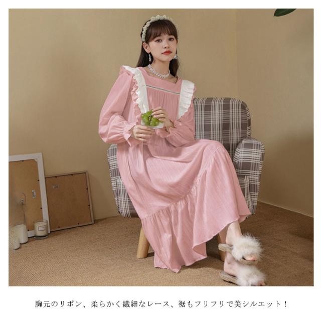 春秋 秋冬 リボン 純綿 フリル かわいい ネグリジェ コットン ロングワンピース 長袖 ルームウェア パジャマ ナイトウェア ゆったり ネグリジェ レディース フレア 部屋着 母の日 大人 マタニティ プリンセス風