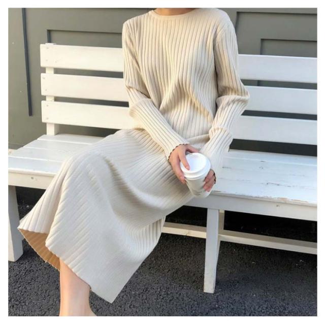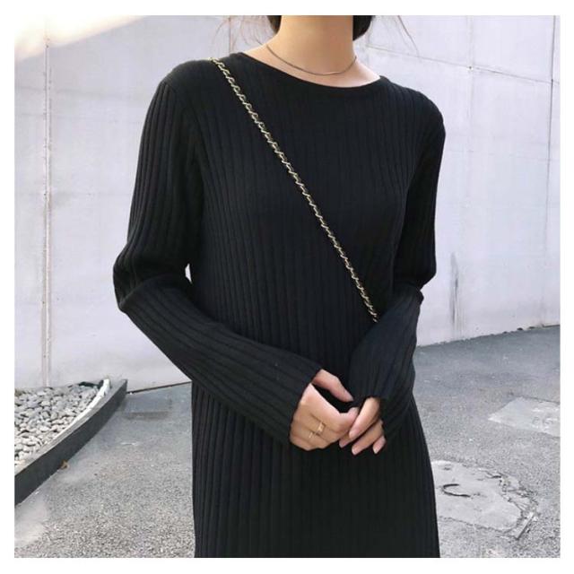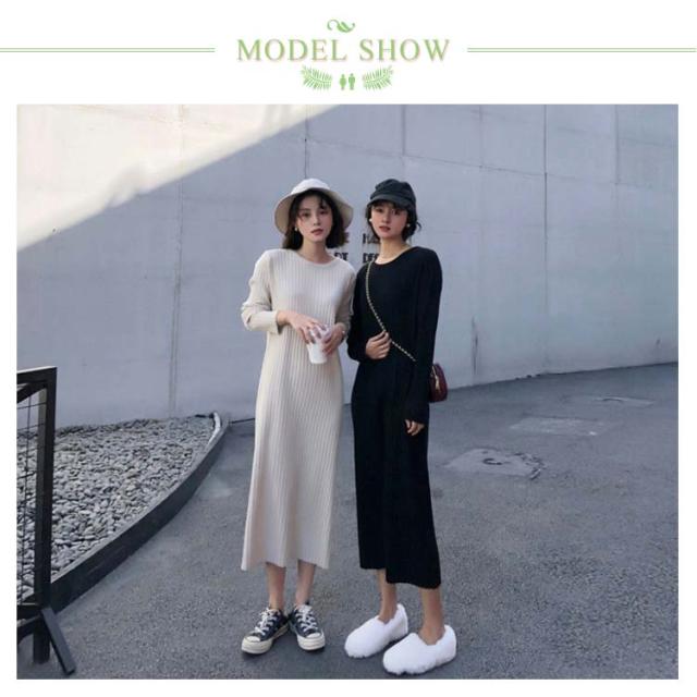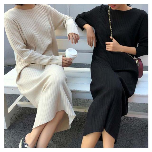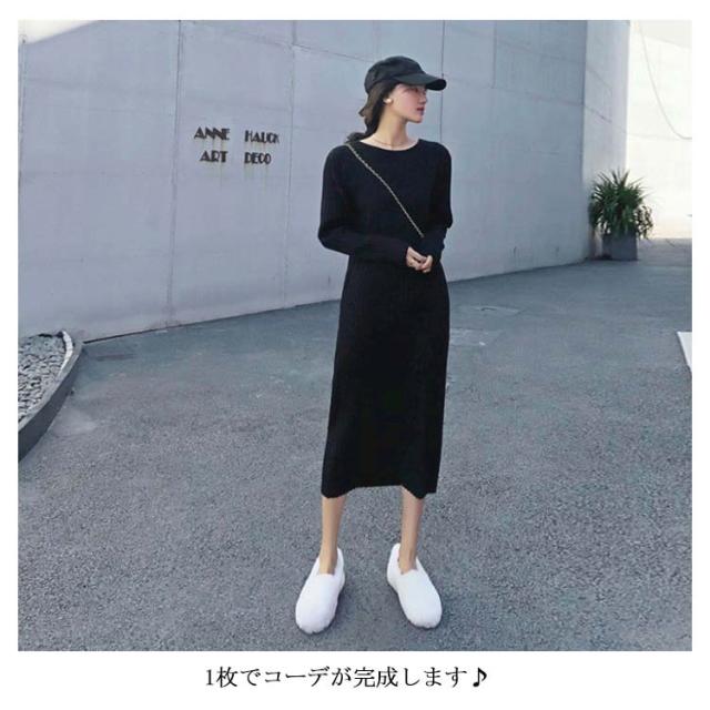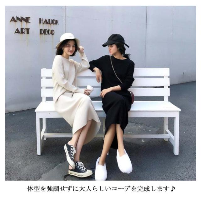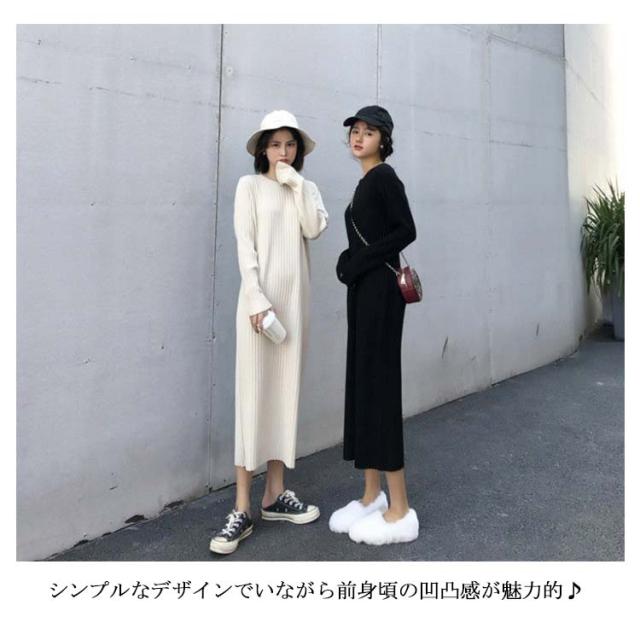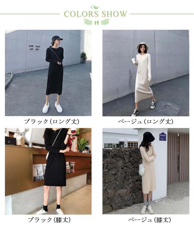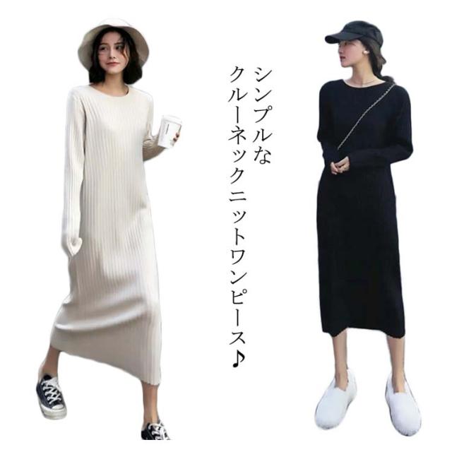 ロング丈 レディース リブ 長袖 リブワンピース ワンピース ニット 2種類着丈選べる!ニットワンピース フェミニン クルーネック 女っぽ 可愛い 大人 2種類着丈選べる!ニットワンピース 着痩せ 細見え 膝丈
