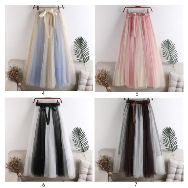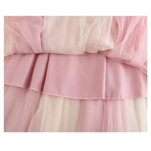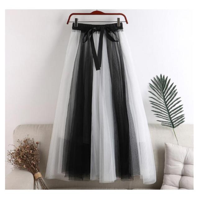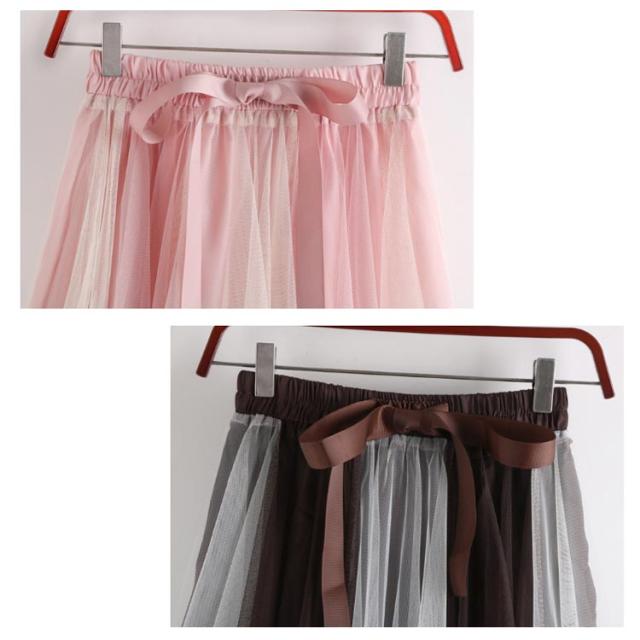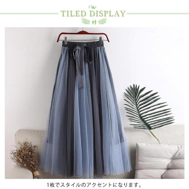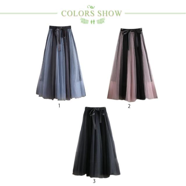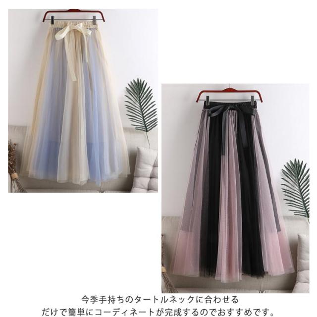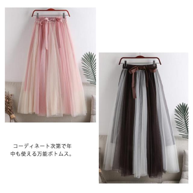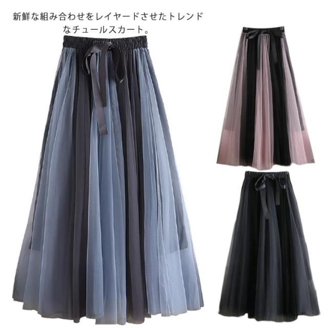 チュールレース切替 フレアスカート ロング プリーツスカート 春 ロングスカート 配色 チュールスカート 大人 フレア チュールスカート レディース マキシスカート リボン付き ウエストゴム 可愛い 春 夏 秋 スカート