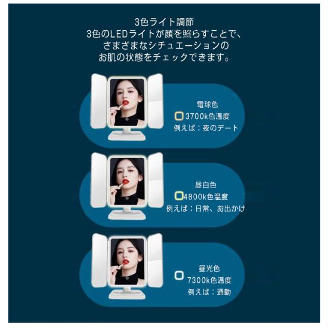 | 素材 | 商品仕様: ●ABS材質 +ミラーガラス ●52個LEDライトあり ●タッチ式調光 ●3色ライト調節可能 ●180°回転できる ●USB給電式 ●三面鏡、折り畳み式 注意: ※日本語説明書なし、使用時、何かご不明なところがあれば、お気軽にこちらのお問い合わせください。 ※長く集中して見続けると、目が疲れたり気分が悪くなる場合がありますのでご注意ください。 |