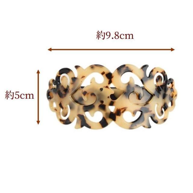 | サイズについての説明 | レースのような透かし彫りがおしゃれな、べっこう柄のバレッタです。 留めるだけで普段のヘアアレンジを大人かわいく変身させてくれます♪ 【サイズについて】 画像をご参照ください。 |