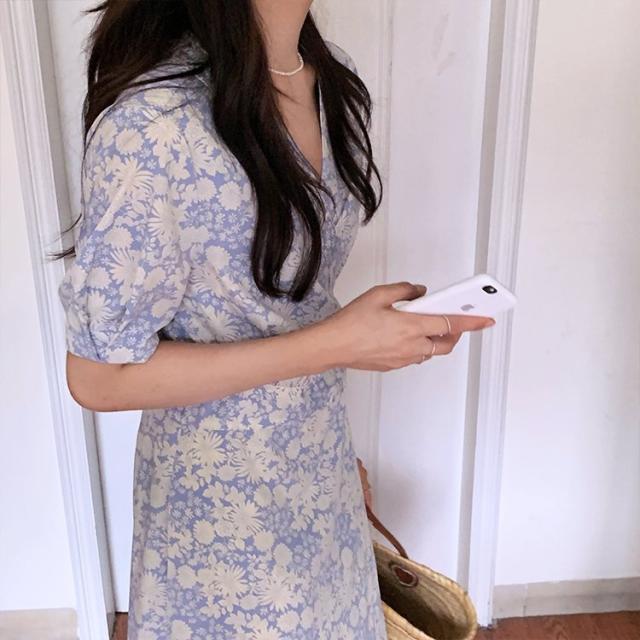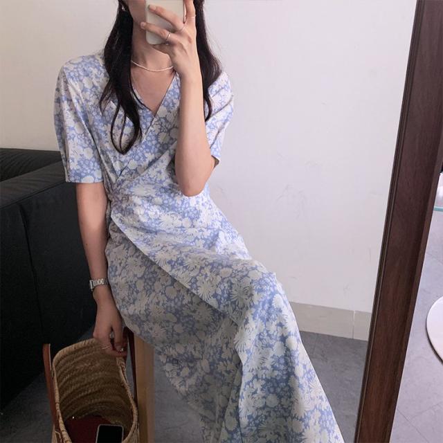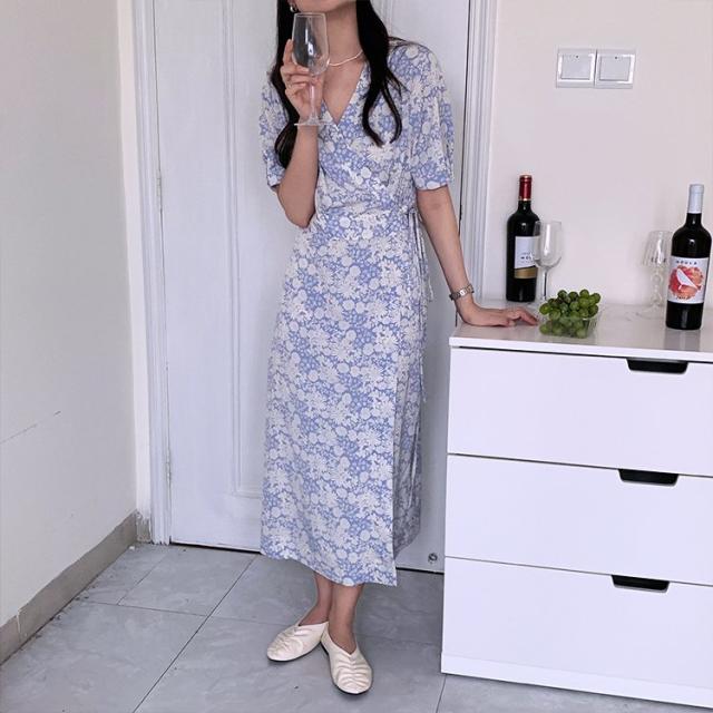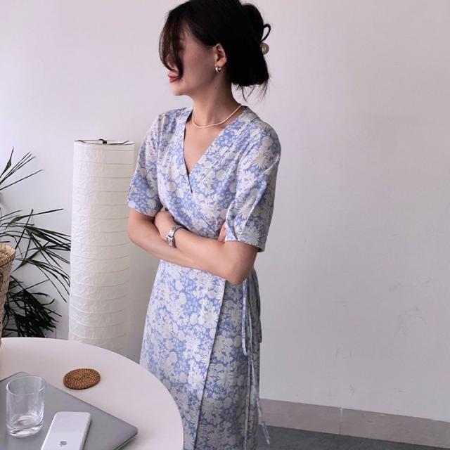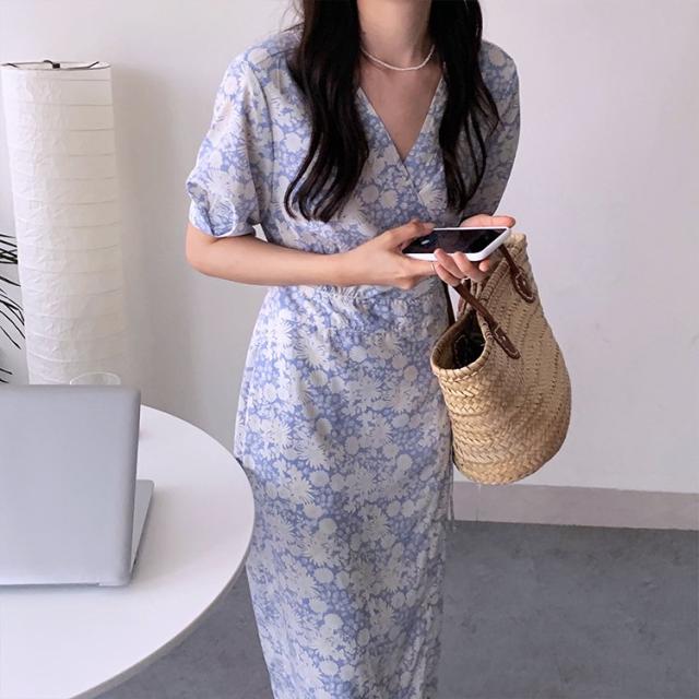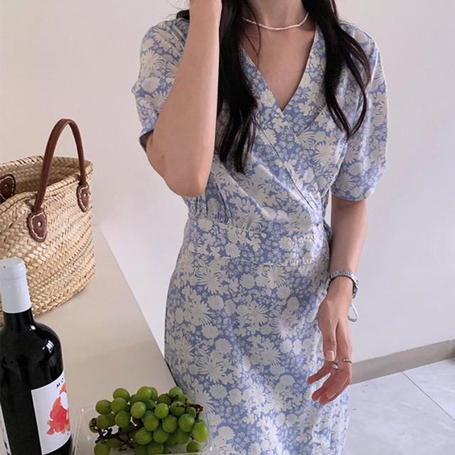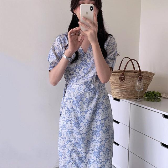 花柄 ワンピース ラップ 花柄ワンピース 半袖 カシュクール パフスリーブ ラップワンピース ワンピース 韓国ファッション