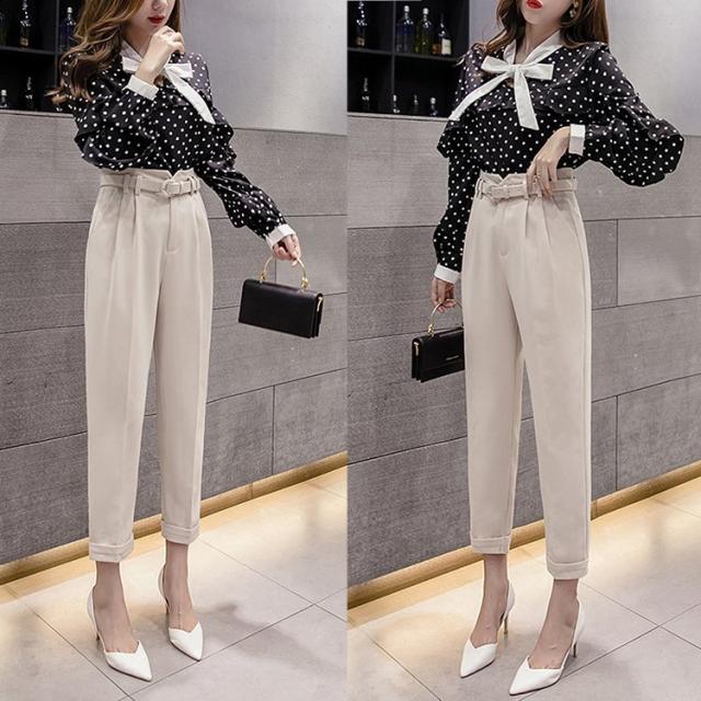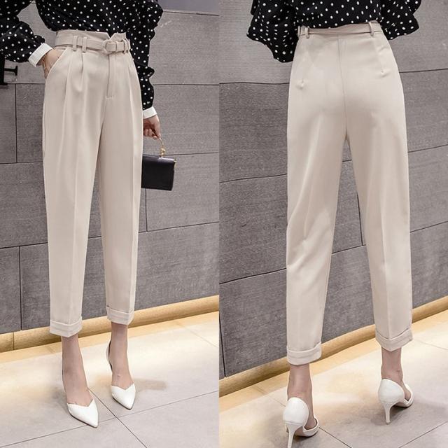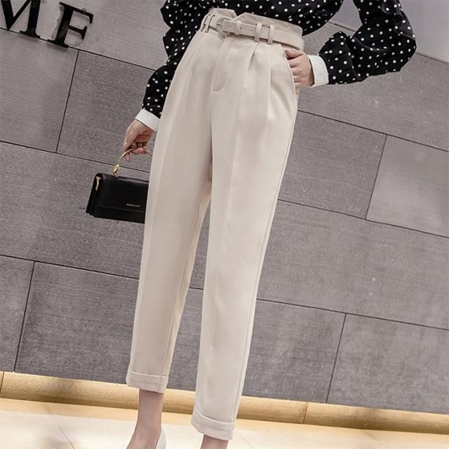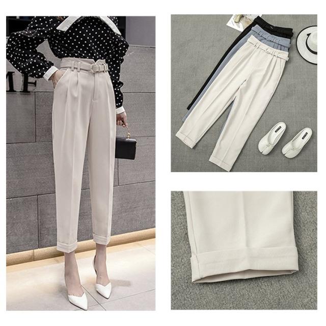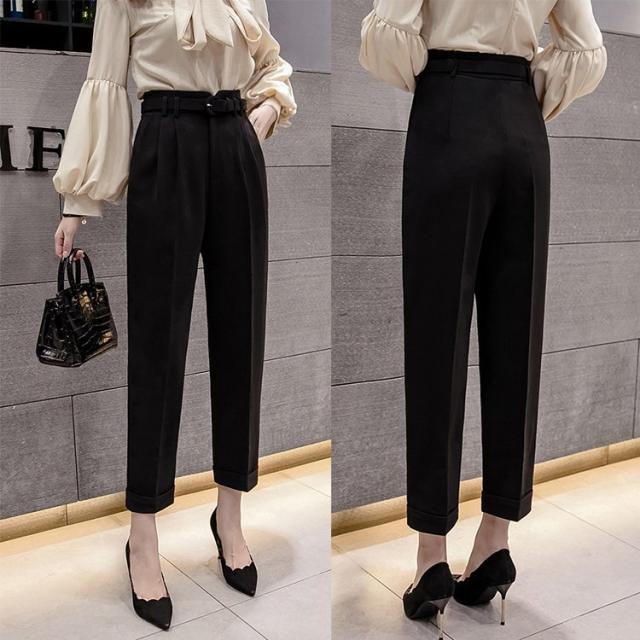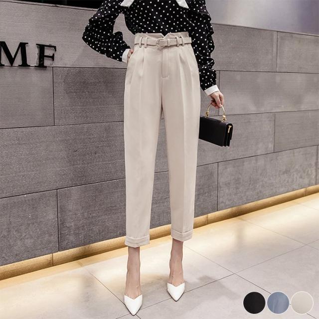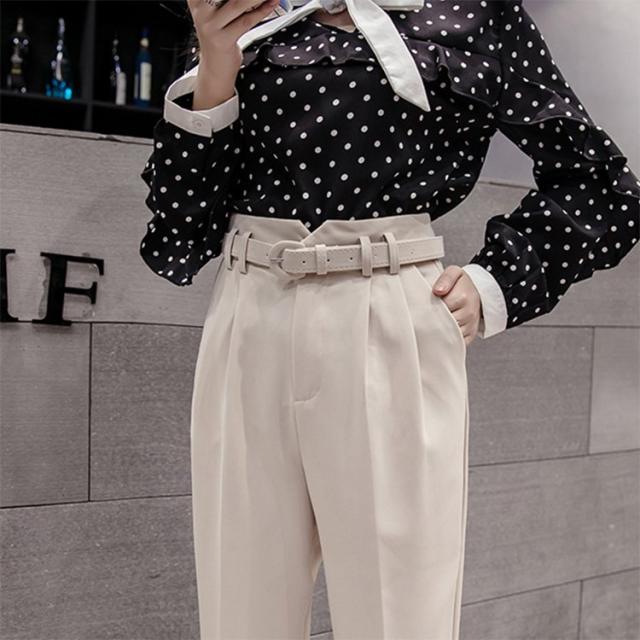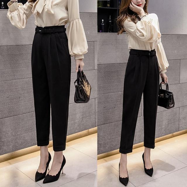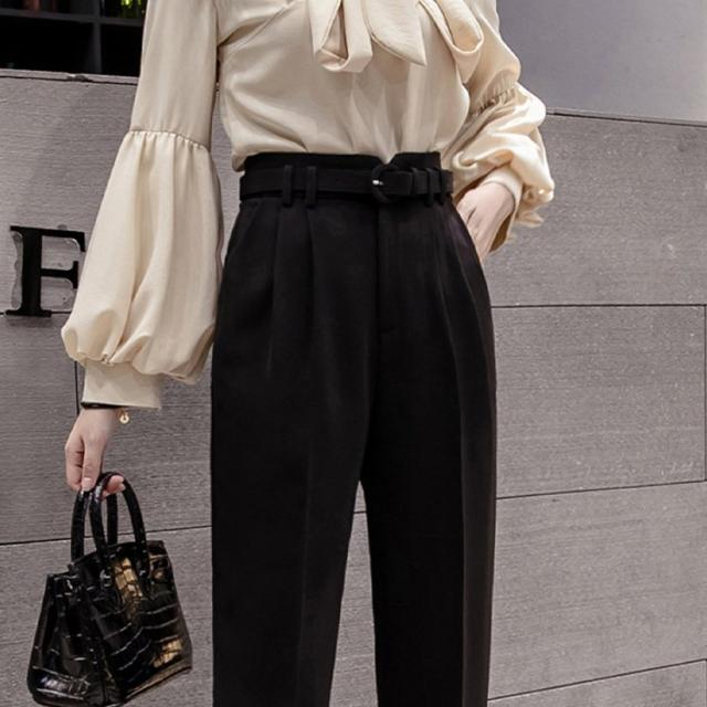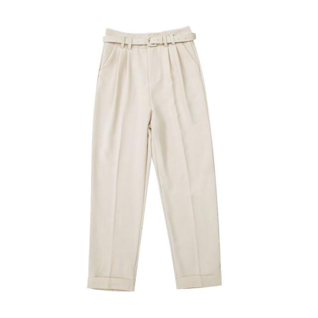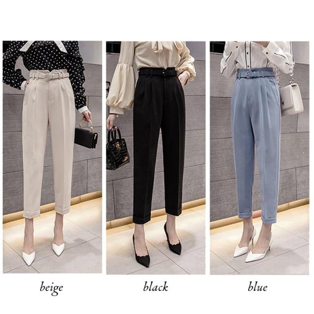 テーパードパンツ エレガント ハイウエスト 9分丈 タック ウエストマーク ベルト付 OL テーパードパンツ ベージュ レディース 黒 青 韓国ファッション