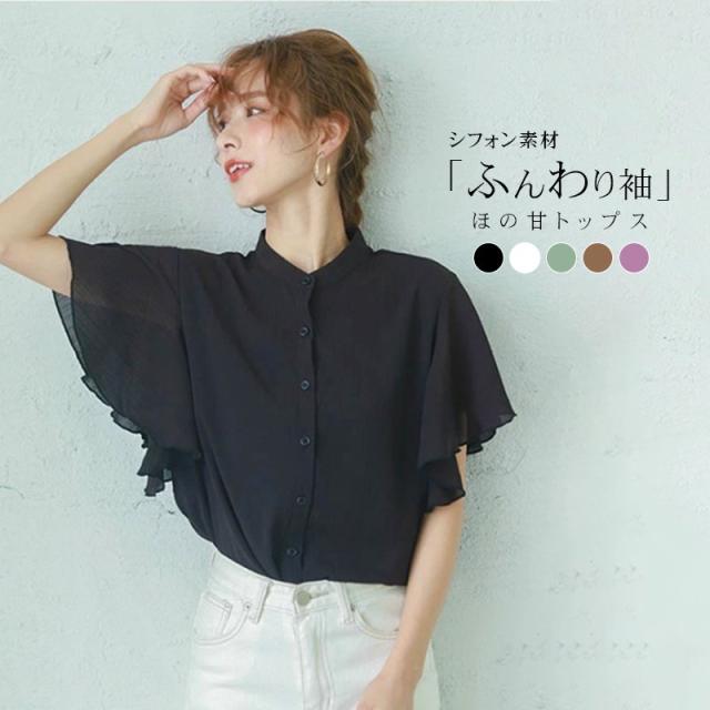 ブラウス ブラウス シフォン 無地 半袖 涼感 涼しい スタンドカラー 肩フリル シャツ レディース きれいめ 可愛い 細く見える 春 夏 人気 2021新登場