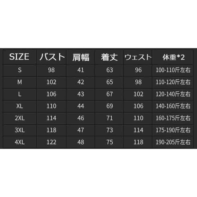 | サイズについての説明 | サイズ(cm) : 肩幅/バスト/ウエスト/着丈cm S 41 98 96 63 M 42 102 98 65 L 43 106 102 67 XL 44 110 106 69 2XL 46 114 110 71 3XL 47 118 114 73 4XL 48 122 118 75 |