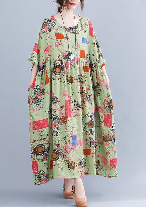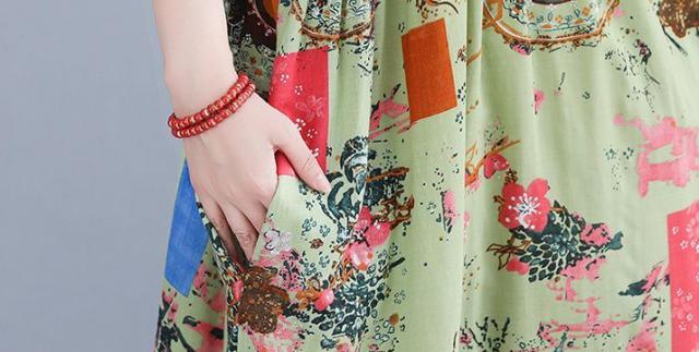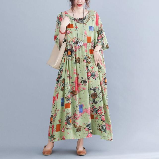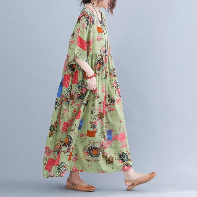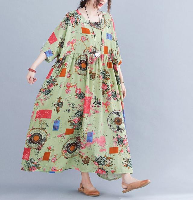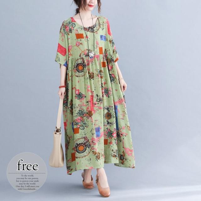 ワンピース ミセス 袖ゆったり 5分袖 総柄プリント ロングワンピース ポッケ ラウンドネック ふんわり 食事会 ワンピース お出かけ
