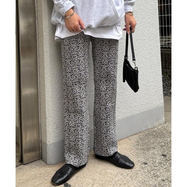 シンプルなトップスを合わせるだけで完成するジャガード柄のパンツ。