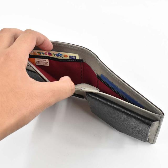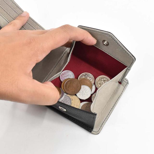 小銭入れはボックス型になっており、中身がよく見え、取り出しやすい設計になっています。また、カードポケットは見開き部分のほか、札入れの中にも配置。オープンポケットを含め全9か所のポケットを装備しています。
