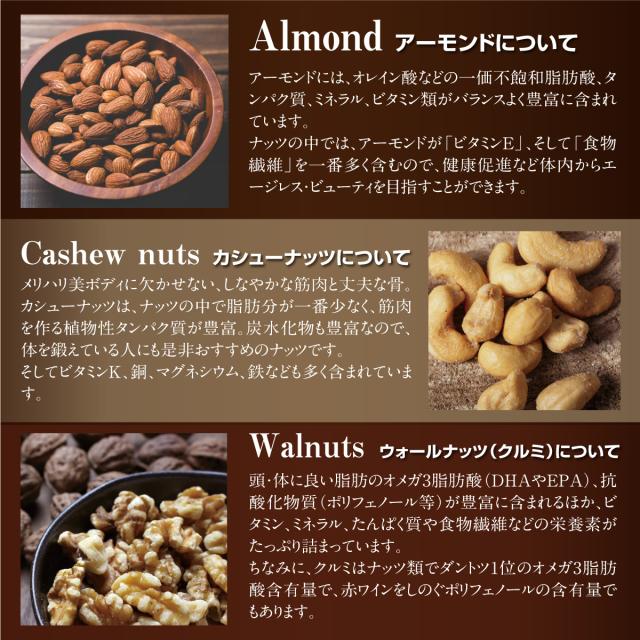 【内容量】カシューナッツ40%、アーモンド30%、ウォールナッツ(くるみ)30%の配合。合計500g大容量。