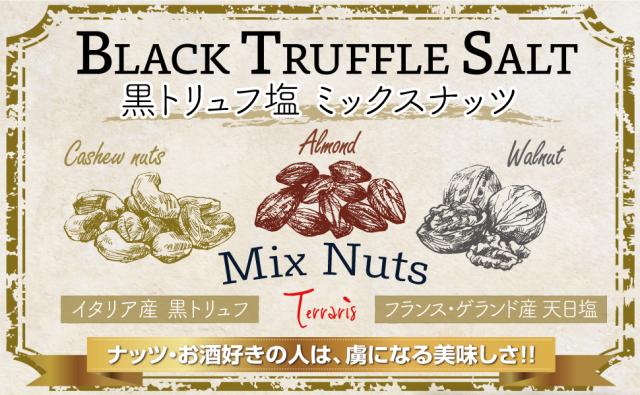 世界で最も高級で芳醇な香りの食用キノコ『イタリア産の高級黒トリュフ(別名:黒のダイヤモンド)』と、美食の国で愛好されている『フランス・ゲランド産の天然天日塩(粗塩)』を絶妙な配合で味付けした、3種の黒トリュフ塩ミックスナッツ。