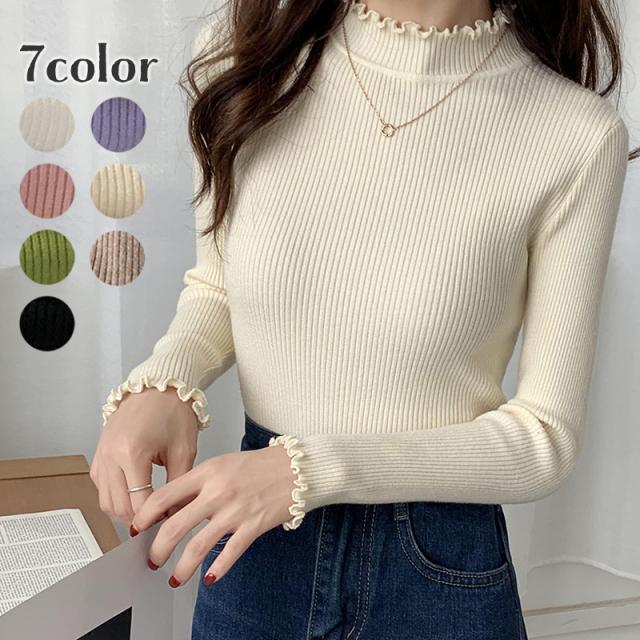 ニット セーター 長袖 ハイネック トップス レディース メロウフリル リブニット 無地 単色 シンプル 定番 着回し おしゃれ