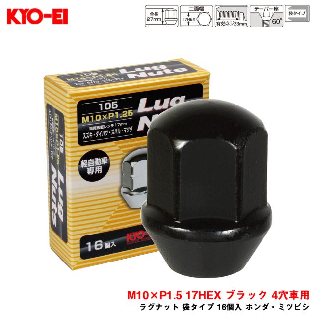 KYO-EI/協永産業 ラグナット 袋タイプ 16個入 ホンダ・ミツビシ M10×P1.5 17HEX ブラック 4穴車用 104B-16P