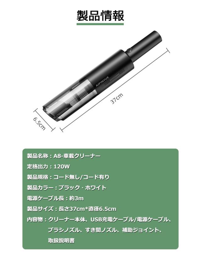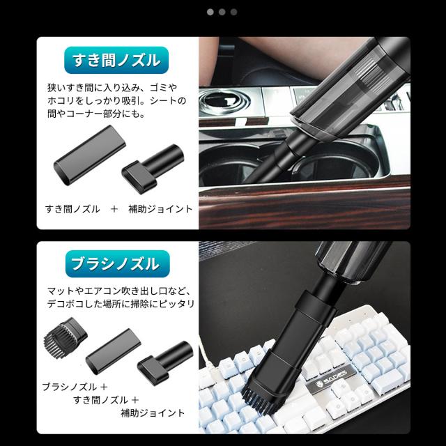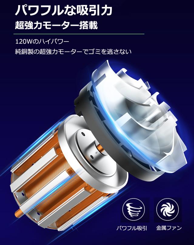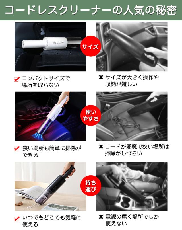 120W車用掃除機と科学的な層状吸引設計により、ペットの毛、花粉、ダニ、ゴミ、髪の毛、ほこりなどの小さな粒子を吸引。