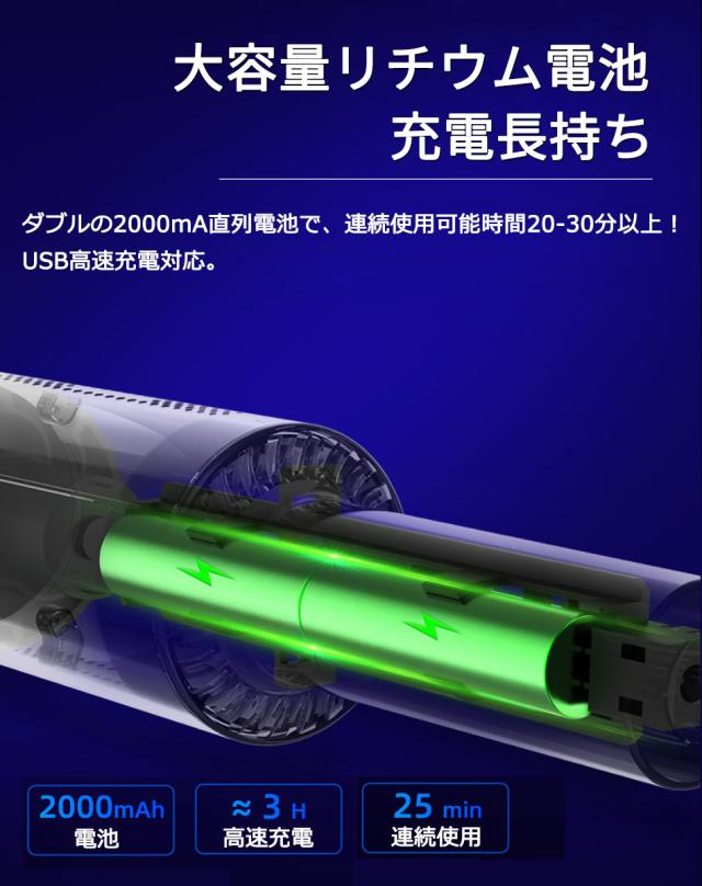 大容量リチウムバッテリーで長持ち。30分間継続的に使用可能。