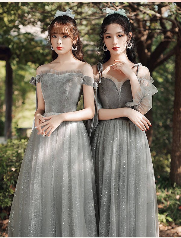 ブライズメイドドレス ロング グレー 結婚式 ドレス 体型カバー イブニングドレス キラキラドレス パーティードレス 結婚式ワンピース ピアノ発表会ドレス オフショルダー キャミソール Vネック ハイネックXS S M L XL 2XLdv037s1