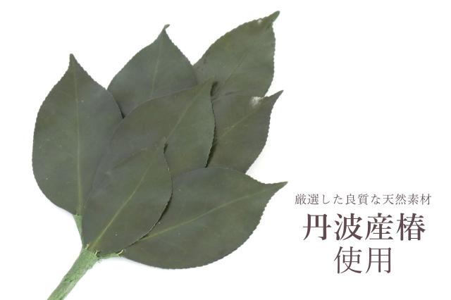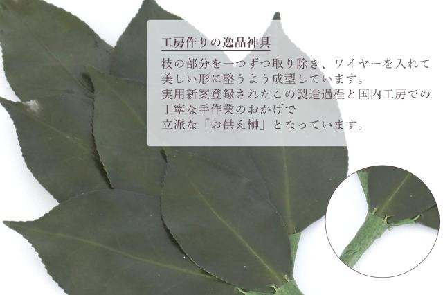 厳選した丹波産椿(つばき)の葉を1枚1枚ていねいに編み込んで製作したプリザーブド加工の榊、2本一対となります。