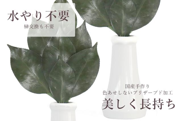 プリザーブド加工の榊は枯れることがないので、交換の必要がなく、水やりも不要。