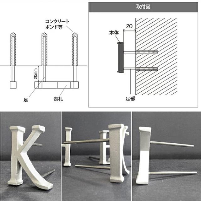 シルバーの足部はステンレス製なので錆びる心配がありません。また、足のカラーはシルバーで統一されており、壁の色を足に写し込むことで、足の色が壁の色と同化し、表札の文字だけが本当に浮いているように見えるような作りとなっています。