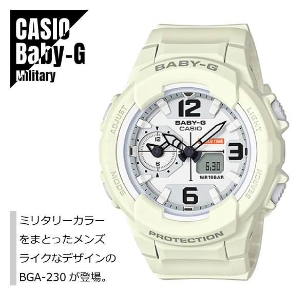 アクティブな女性のためのカジュアルウオッチBABY-Gから、ミリタリーカラーをまとったメンズライクなデザインのBGA-230が登場。