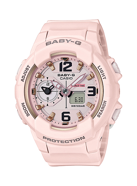ベースモデルには、視認性の高い大きく立体的なインデックスとメンズライクなデザインが特徴のBGA-230を採用。色は、スカジャン等のストリートファッションアイテムで流行しているパステルカラーのピンク。文字板はメタル素材を2層組み合わせたデザインで、立体的でクールな仕上がりになっています。