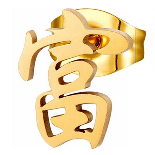 ステンレス製に金メッキしたゴールドカラーの漢字の「 富 」をモチーフにしたユニークで面白いステンレスピアス。