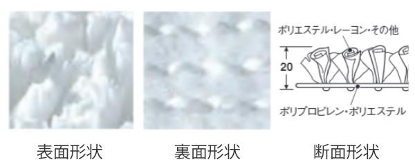 | 材質 | 基布:ポリプロピレン・ポリエステル パイル:ポリエステル・レーヨン・その他 ※塩ビ不使用 ※再生素材 |