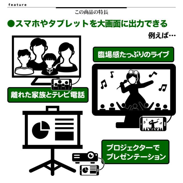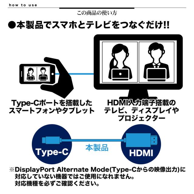 Type-Cポートを搭載した機器の映像信号を変換し、 HDMI入力端子を搭載したテレビ、ディスプレイ、 プロジェクターに出力することができます。