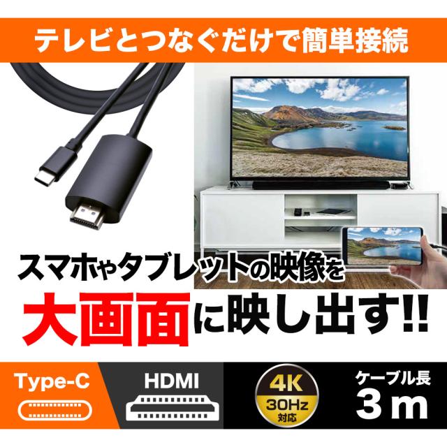 ラスタバナナスマホ タブレット ミラーリングケーブル 4K フルHD対応 Type-C to HDMI 出力ケーブル 3メートル タイプC テレビ