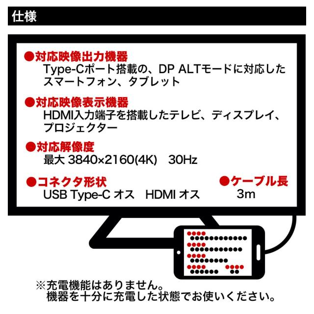 【ネコポス不可】ラスタバナナ スマホ タブレット ミラーリングケーブル 4K フルHD対応 Type-C to HDMI 出力ケーブル 3メートル タイプC テレビ ディスプレイ プロジェクター 大画面 3m ブラック スマートフォン テレビ電話 プレゼン ゲーム 動画 R30CACH01BK