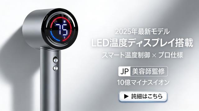 3段階風量×3段階温度+冷風=12通りのカスタマイズ。冷熱リズムモードでサロン級仕上げ。ペットの毛ケアにも最適。