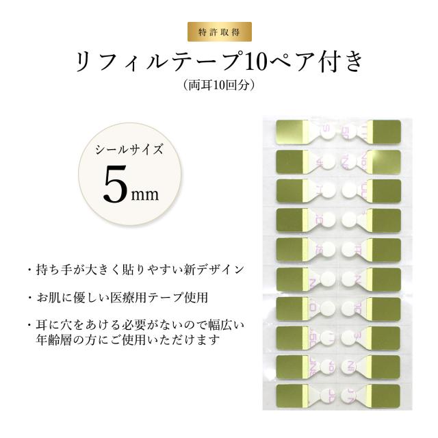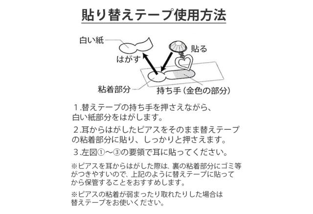 【grace貼るピアスとは?】専用テープで貼るだけ簡単ピアス! 穴が開いていなくても、金属アレルギーでも大丈夫。 痛みがなくおしゃれが楽しめます。grace貼るピアスのテープは安心の国内産医療用テープを採用しております。貼るピアスは専用テープがあれば繰り返しお使い頂けます。