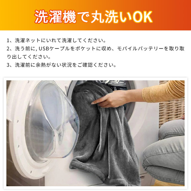 やわらかい肌触りで全体的に洗える:ふわふわの肌触り、温かみのある、着心地の良い毛布です。洗濯機で洗えます。配線等が水に濡れても問題ありません。(注意:1。洗濯の際は、洗濯ネットに入れてください。2。USBデータケーブルを外す必要はありません。3。携帯電源を外して洗濯してください。)