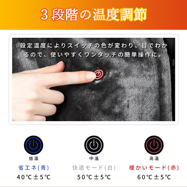 3温度調整:温度調整ボタンで、お好みに合わせて3段階の温度を調整できます。35°C-60°Cの調整範囲は必要に応じて選択でき、電源はそのタイミングで自動的に遮断されます。寝ても大丈夫です。USBポート出力:5V/2A、エネルギーを節約します。