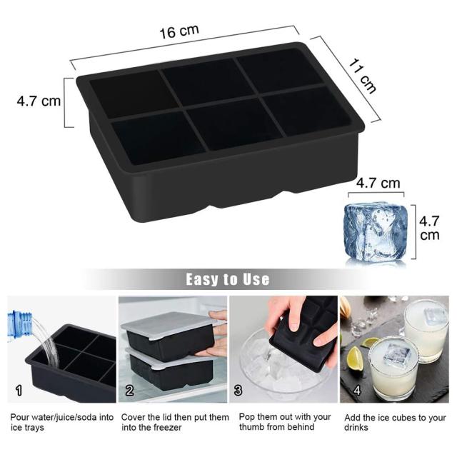 蓋付きの角氷:1つの角氷トレイと1つの角氷、各角氷トレイには、角氷をきれいにするためのシリコンカバーの蓋が付いており、そこから6つの角氷を作ることができます。これらの角氷は家族、パーティー、バーにとって重要です! (蓋と角氷トレイがくっつくのを防ぐために、角氷トレイを傾けるときの蓋は漏れを防ぎません。)