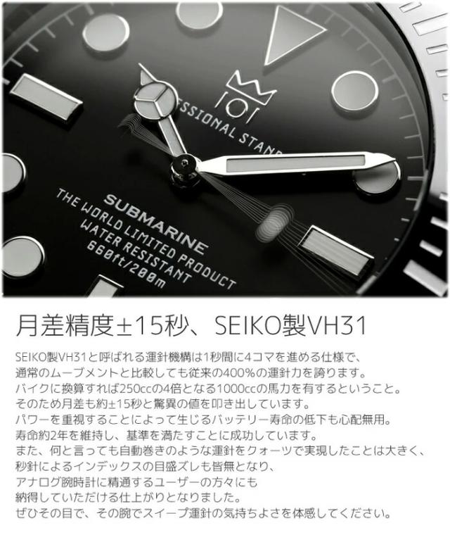 機械式とクォーツの融合 1/4秒運針ムーブメントのパワーと正確性 HYAKUICHI 101 ヒャクイチ 20気圧防水 スイープセコンド ダイバーズウォッチ セラミックベゼル ノンデイト 腕時計 HYAKUICHI-ひゃくいち- SUBMARINE-サブマリン- 101-001S ダイバーズモデル ISO規格では通常『最低100m以上の防水性能を持ち、 潜水経過時間を計測できる装置(回転ベゼルなど)を備えた時計』 と定義付けがされたダイバーズウォッチ。 その基準を大幅に上回わるhyaku1-001sは、 信頼の日本製ムーブメントを使用し、逆回転防止セラミックベゼル、 ねじ込み式リューズなどダイバー用途でも使用可能なハイスペックモデルです。 HYAKU1-001Sの特徴 ●クォーツ(SEIKO製)[スイープセコンド:1/4秒運針] ・・・1秒ごとに運針する秒針とは違い、機械式のような運針を楽しめ、時刻の正確性はクォーツの中でも屈指 ●20気圧防水 ・・・水深200mの水圧に耐えることができる防水性 ●逆回転防止セラミックベゼル ・・・マーカーを彫り込み、ツヤが美しく、傷の耐性も抜群のセラミックを採用 ●ねじ込み式リューズ ・・・安心第一、水の侵入を完全シャットアウト ●ノンデイト ・・・ノンストレスという機能、日付合わせ不要の喜び ●オールヘアラインステンレスブレスレット ・・・しっとりと輝く、ポリッシュとは異なる控えめな上質感を採用 ●ロック機構付き方開き式バックル ・・・安全性と利便性の融合、ワンタッチ着脱可能で不注意による落下なし ●アプライドインデックス ・・・文字盤内にも存在感、必要です ●スクリューバック ・・・安心第一、水の侵入を完全シャットアウト ■機能 スイープセコンドSEIKO VH31(日本製クォーツムーブメント) ダイバーズウォッチ(20気圧防水) 逆回転防止セラミックベゼル ねじ込み式リューズ ヘアラインステンレスブレスレット ロック機構付き方開き式バックル アプライドインデックス スクリューバック ■素材 ステンレススチール セラミック 電池:SR920SW ■サイズ ケース:約H50×W45×D12mm フェイス内径:約31mm フェイス外形:約42mm 最大腕回り:約200mm 重量:155g ■付属品 説明書兼保証書 保存箱 ■カラー ブラック |