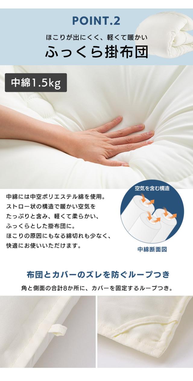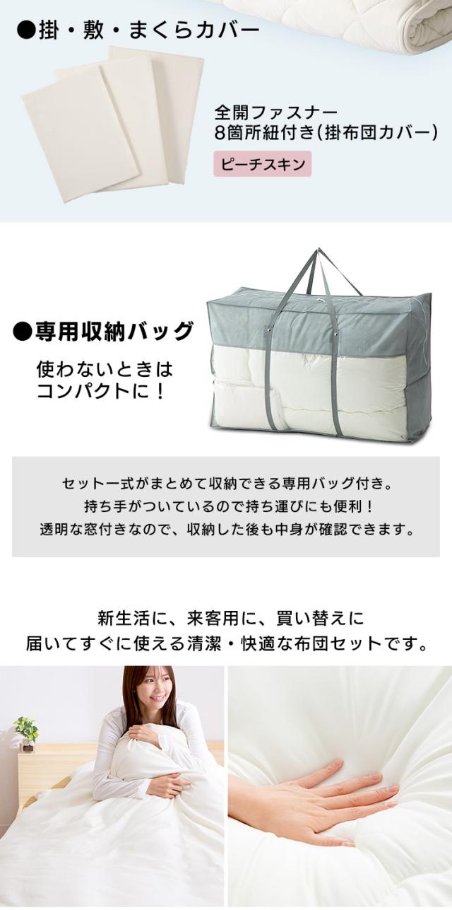 枕×1、掛布団×1、敷布団×1、掛・敷・枕カバー×各1、専用収納バッグ×1