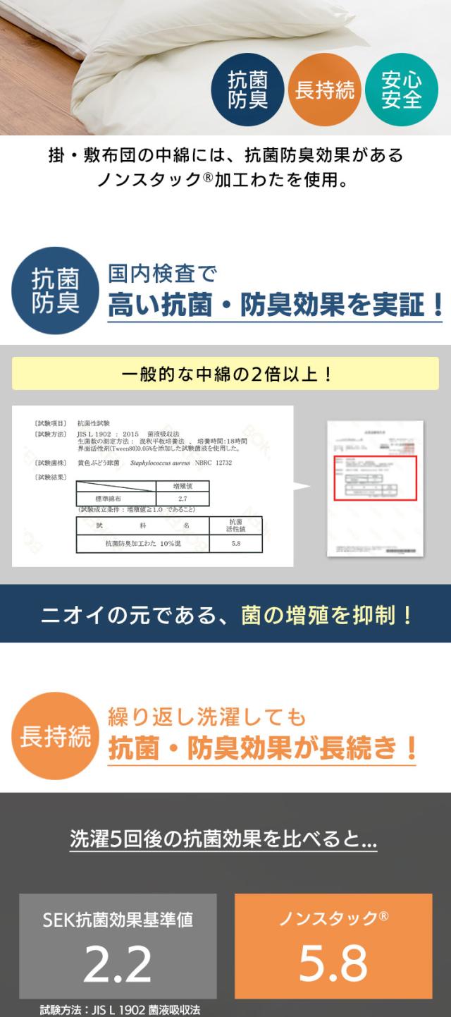 掛・敷布団の中綿には抗菌防臭効果があるノンスタック(R)加工わたを使用しています。