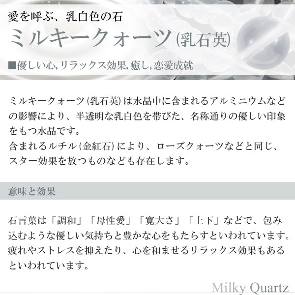 ミルキークォーツ(乳石英)は「調和」「母性愛」「寛大さ」「上下」などの石言葉をもち、包み込むような優しい気持ちと豊かな心をもたらすといわれています。
