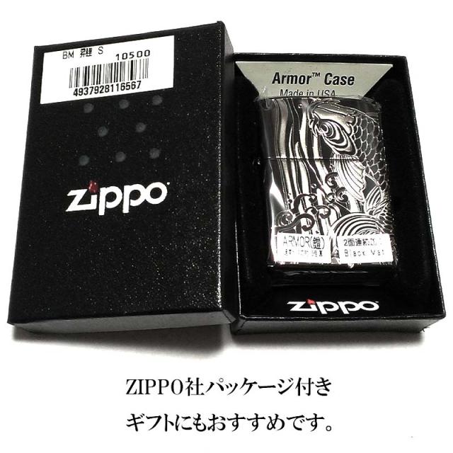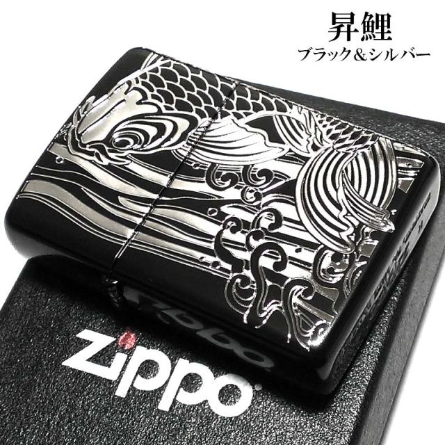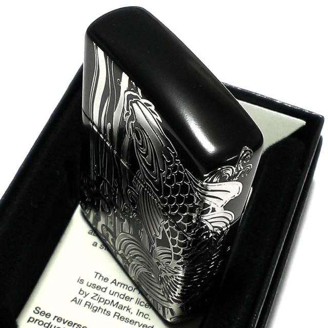 ZIPPO アーマー 昇鯉 ブラック&シルバー 二面連続深彫り ジッポ 銀差し ライター 黒 銀 重厚 かっこいい 高級 おしゃれ メンズ ギフト プレゼント