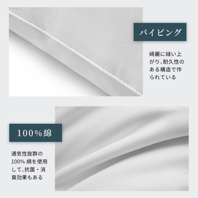 羽毛の特長である柔らかさと弾力性を持った化学繊維で、型崩れしにくく耐久性にも優れています。羽毛のようなふんわり感と高い反発力と耐久性が持っている、毎日ホテルのようなふわふわピローが使えます。