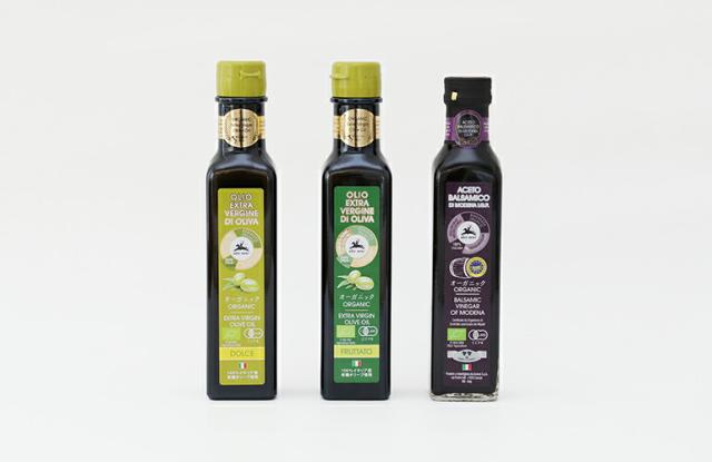 写真左から: 有機エキストラヴァージンオリーブオイル 250ml【ドルチェ】やさしくマイルドな香り。どのようなお料理にも合わせやすいタイプ。【主な品種】ビアンコリッラ種、カロレア種 等 【オリーブの産地】南イタリア(主にプーリア、シチリア、カラブリアの3州) 有機エキストラヴァージンオリーブオイル 250ml【フルッタート】フルーティーな香り。オリーブの香りを楽しみたいときにおススメ。【主な品種】コラティーナ種、チーマ・ディ・ビトント種 等 【オリーブの産地】南イタリア(主にプーリア、シチリア、カラブリアの3州) 有機バルサミコビネガー 250mlイタリア産の有機栽培ブドウから作られたモデナ産バルサミコ・ビネガー。酸化防止剤などの添加物は使用しておりません。ドレッシング、マリネ、肉料理のソースに◎。 | |||||||||||||||||||||||||||||||||||||||||||||||||