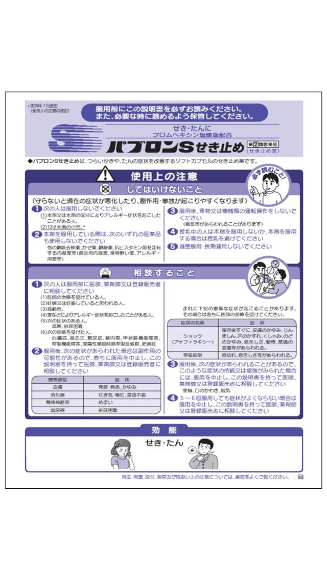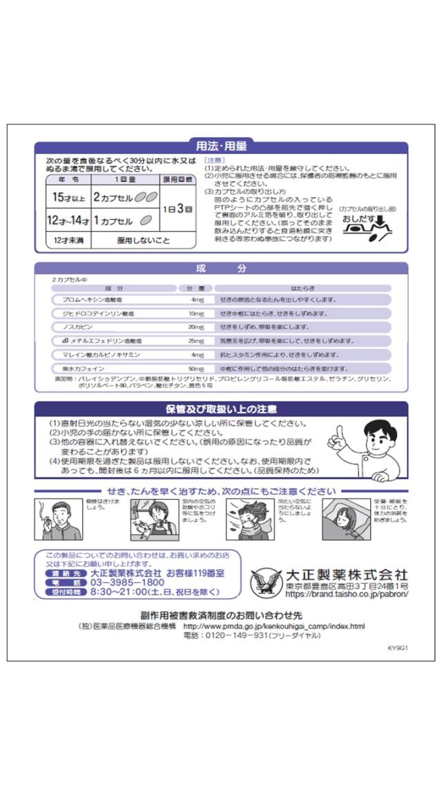 商品名 指定第2類医薬品 パブロンSせき止め 24カプセル ※セルフメディケーション税制対象商品 大正製薬 容量 24カプセル JANコード 4987306051546 メーカー 大正製薬 カテゴリー 医療・介護・医薬品>医薬品>のどの薬>のどの薬【第一・二類医薬品(指定第二医薬品含む)】 効果・効能 せき、たん 用法・用量 次の量を1日3回、食後なるべく30分以内に水又はぬるま湯で服用してください。15才以上 1回2カプセル、12才〜14才 1回1カプセル、12才未満 服用しないこと。 セルフメディケーション税制対象 対象 区分 指定第二類医薬品
