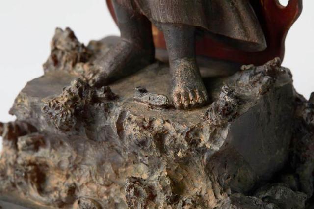 大日如来の使い、または化身として衆生を正しい道へと導く不動明王。 「不動」は揺るぎのない強い心と智慧を意味し、右手に智慧の剣、左手に救いと戒めの羂索(けんじゃく)を持ちます。 激しい憤怒相はすべての衆生を救うという強い決意の表れで、立像での表現は、迷える私たちを救わんと立ち上がった姿とも言われます。