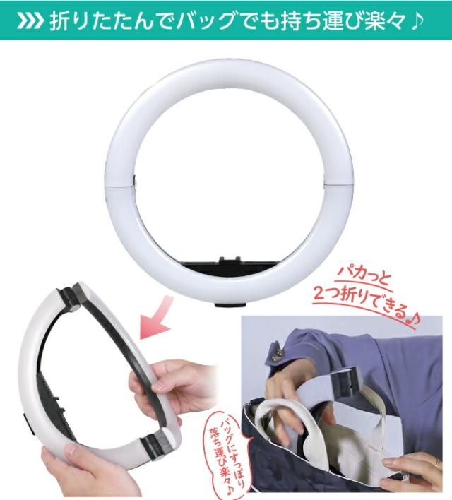 丸型なのに2つに折りたためて小さくなる、LEDリングライト。