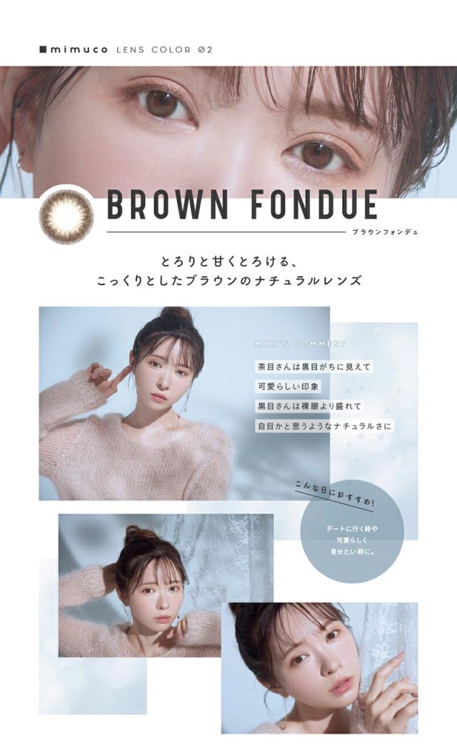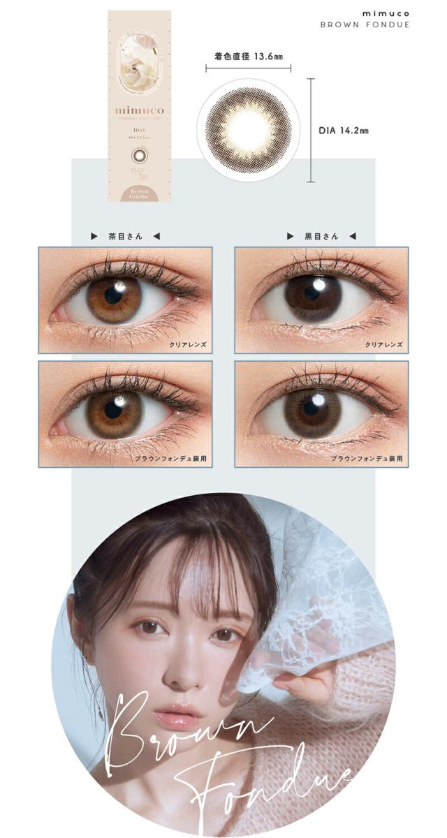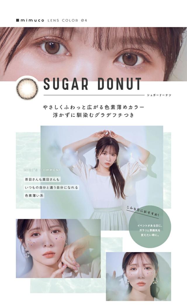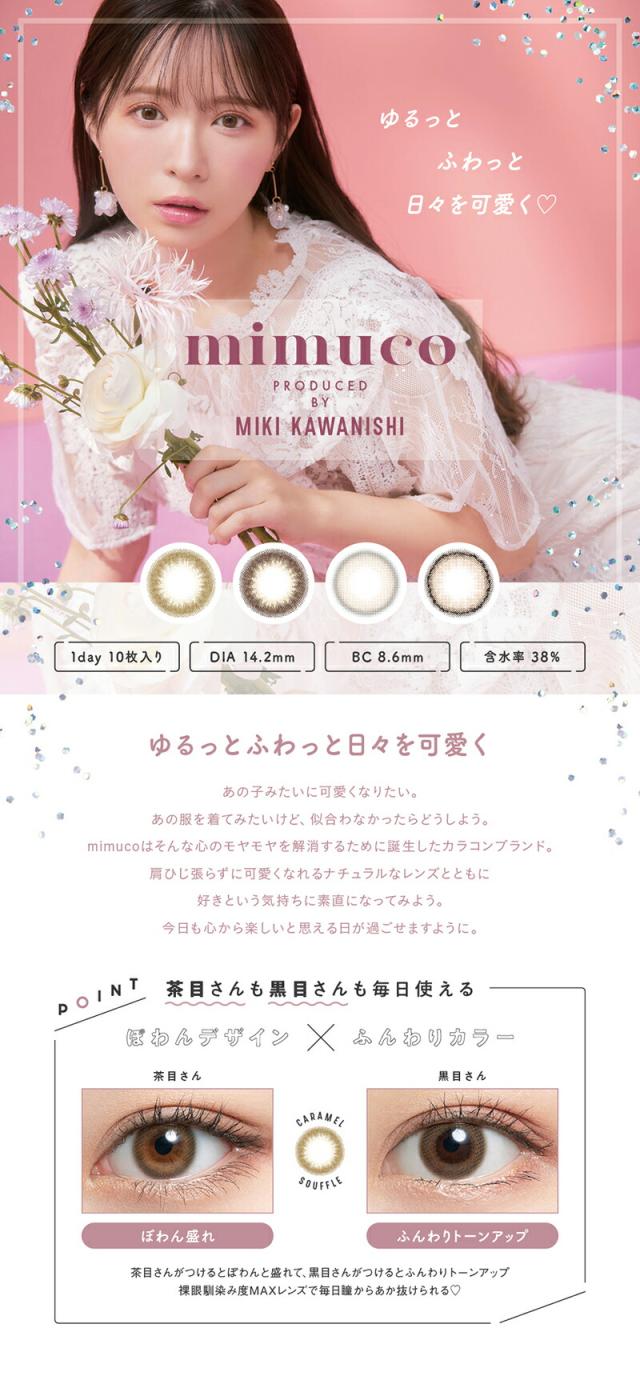 商品詳細: 『mimuco』は、美容系YouTuberとして20代〜30代女性の支持を集める、「かわにしみき(みきぽん)」さんプロデュースのカラーコンタクトです。 「かわにしみき」さんは美容・コスメオタクとして、自分のコンプレックス克服のため、色々なメイクを試した企画をYouTubeにアップしており、その探求心と?のない発信が特に同じ悩みを持った女性から人気です。 そんな「かわにしみき」さんが、毎日付けてほしいカラーコンタクトというコンセプトを基に、既存のトレンドカラコンの "あと少しこうだったら" を追求した、 ナチュラルだけど印象的になれるデイリーユースな4色のラインナップになっています。