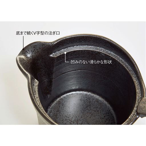左右どちらの手でも握りやすい持ち手、最後の一滴まで注げるよう工夫された注ぎ口。『洗いやすさ』フタ置きの
