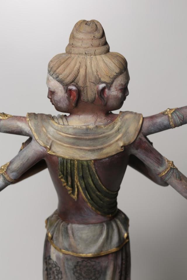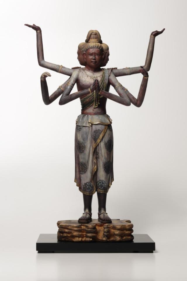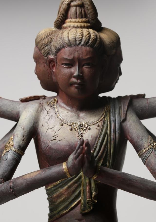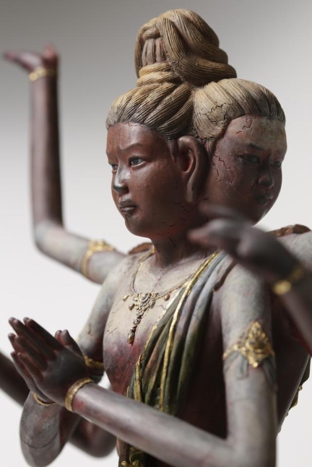 娘を奪われたことに怒り帝釈天と止むことのない戦いを続けていた阿修羅ですが、釈迦の説法を聞いて仏法に帰依し、仏法を守る守護神となりました。 釈迦如来を守る八部衆のほか、千手観音を守る二十八部衆にも取り入れられています。争いの耐えない世界「修羅道」を司ることから通常怒りの表情で表わされることが多いのですが、 光明皇后が造らせたというこのモデル像は、憂いを帯び、どこか少年のようなあどけなさを感じさせます。三つの面はすべて表情が違い、向かって左、右、正面の順に成長する過程であるとも言われています。