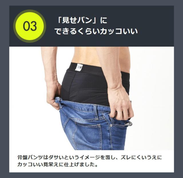 ●「はく骨盤ベルト」を採用 ほど良い締め付けを実現するオリジナルV字パワーネットにより着用中に骨盤をサポート。 もしあなたがお立ちになっている時、腰が痛くなってきたとします。その時にその場でお腹を引っ込めて骨盤を立ててみてください。腰の負担が軽くなるのがわかると思います。 ●キツくないので1日中はいていられる そけい部などのリンパの流れを考慮し、窮屈さを感じず足の動きも楽々。 ●仙骨をサポートし、腰の反りを解消します 仙骨を支え骨盤を立てることで腰の反りを解消し、着用により筋肉への負担を軽くします。 ●「見せパン」にできるくらいカッコいい 骨盤パンツはダサいというイメージを覆し、ズレにくいうえにカッコいい見映えに仕上げました。 ●ムレにくい 男性にとってムレは大きな問題。生地選びから通気性にこだわりました。 ●スッと履ける ●選べるタイプ「前開き・前閉じ」 矯正力が強めがいい方には「前閉じ」がおすすめです。 ●「S〜3L」豊富なサイズ展開